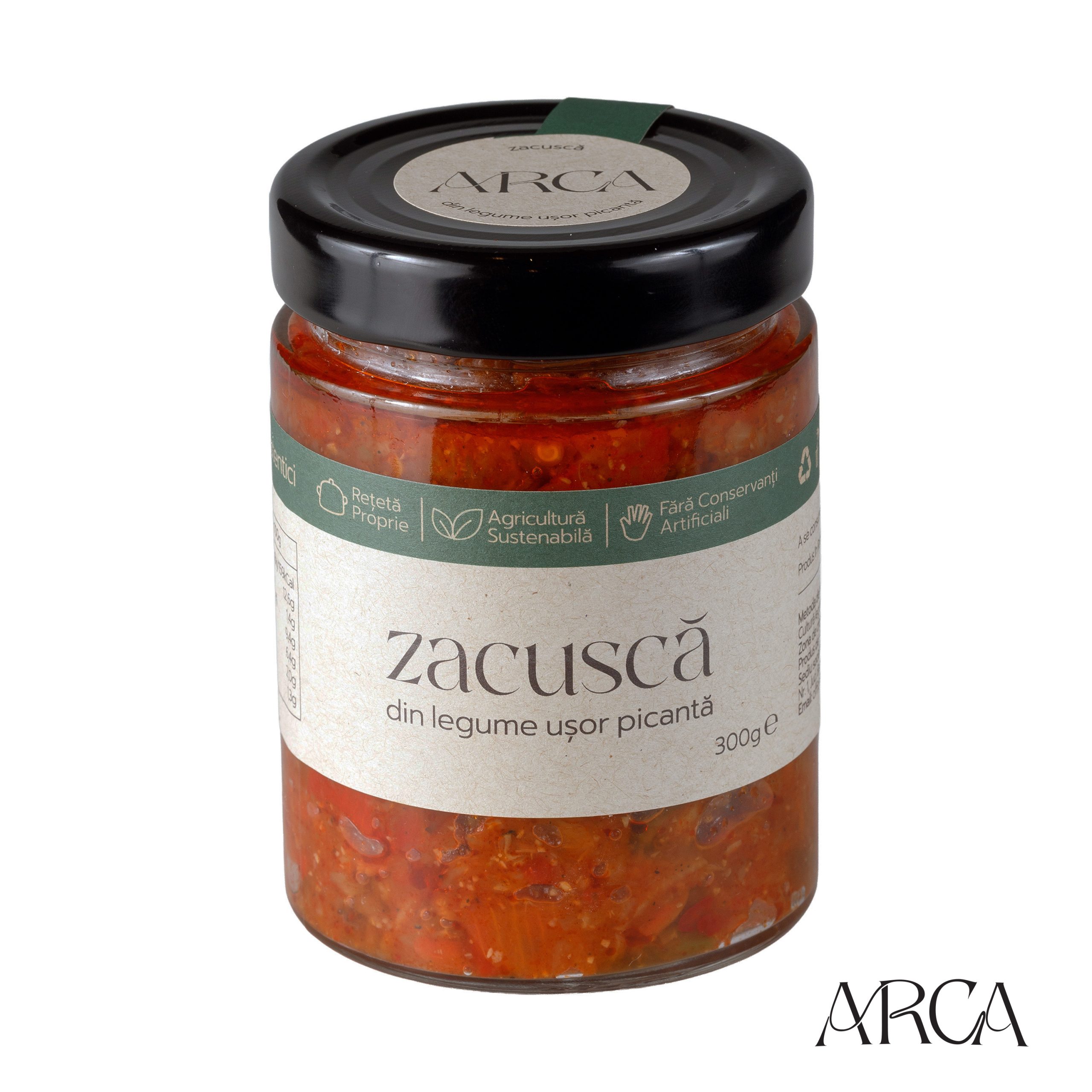 Ingrediente: gogoșari 30%, ardei gras 20%, ceapă, țelină, ardei iuți, ulei de floarea soarelui, pastă de tomate, usturoi, sare, foi de dafin, piper. Produs sterilizat prin duștulire (bain-marie). Condiții de depozitare: încăperi aerisite, ferite de razele soarelui, la temperaturi de maxim 25ºC. Cantitatea netă 300g.