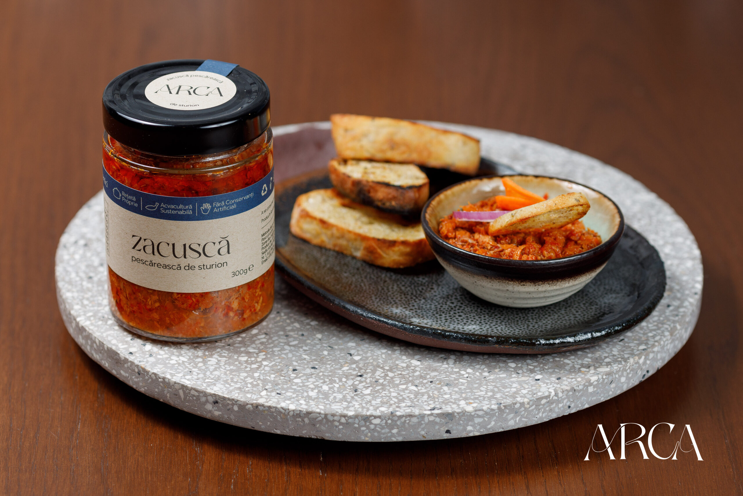 O zacuscă artizanală cu adevărat specială, în care sturionul, cu o textură fină și un gust delicat, se întâlnește armonios cu ardeiul gras și ceapa, gătite lent pentru a-și elibera toată dulceața naturală. Condimentele perfect selecționate îi desăvârșesc aroma, oferindu-i o notă subtilă, dar memorabilă. Fără conservanți, pregătită manual, această zacuscă este alegerea perfectă pentru aperitive sofisticate sau reinterpretări moderne, transformând orice masă într-o experiență gourmet.
